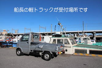 船長の軽トラックが、受付場所となります。 沖釣りの釣り座は、予約順となります。 |